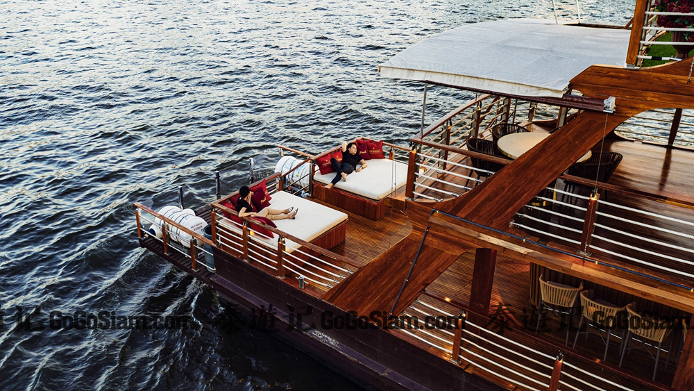 “普鲁克号”游轮是三层设计,传说中是全柚木打造,选用的设施都是高端轻奢品牌。而对于晚餐环节,Pruek Cruise则是专门邀请“米其林”主厨现场操刀,准备了极为用心和精致的各类套餐。2个小时的航行时间,3道小食、4道泰式套餐,配红葡萄酒或鸡尾酒,有专门的服务生现场服务。