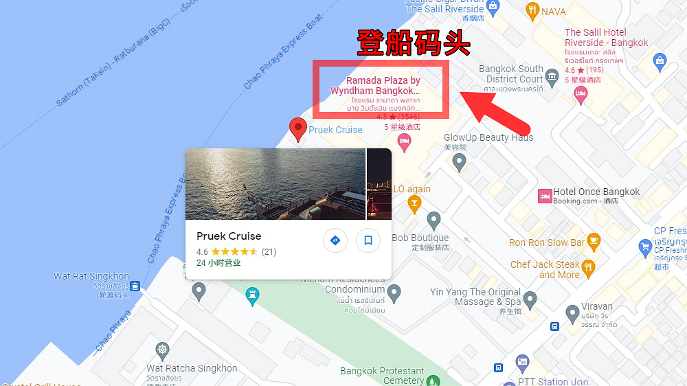 Pruek Cruise地址:2074 Charoen Krung Rd, Wat Phraya Krai, Bang Kho Laem, Bangkok; Pruek Cruise电话:0880801800; Pruek Cruise服务时间:每周六18:45–21:00 其余时间为包船时间,2小时包船行程(含餐食)7-13万泰铢左右。