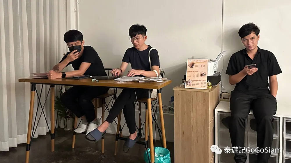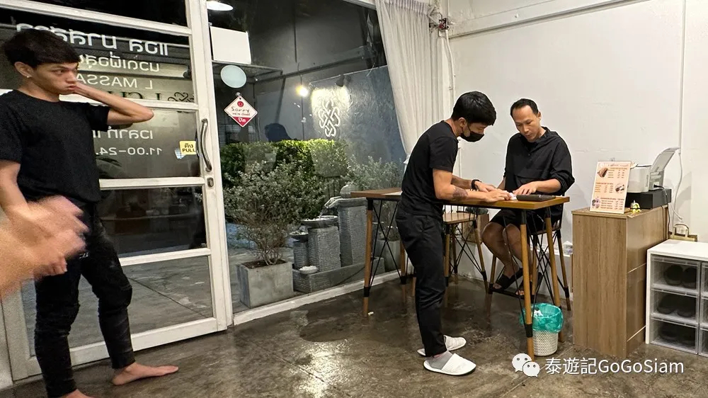 一楼的大厅非常狭小,每天大概10位男性技师驻店。老板开放而又风趣,350泰铢泰式按摩一小时,750泰铢精油按摩一小时。技师颜值不负众望,也是一家主打颜值泰仔按摩的店铺。即便我们点了“大通铺”的一小时泰式按摩,技师仍旧主动、热情、优质服务。