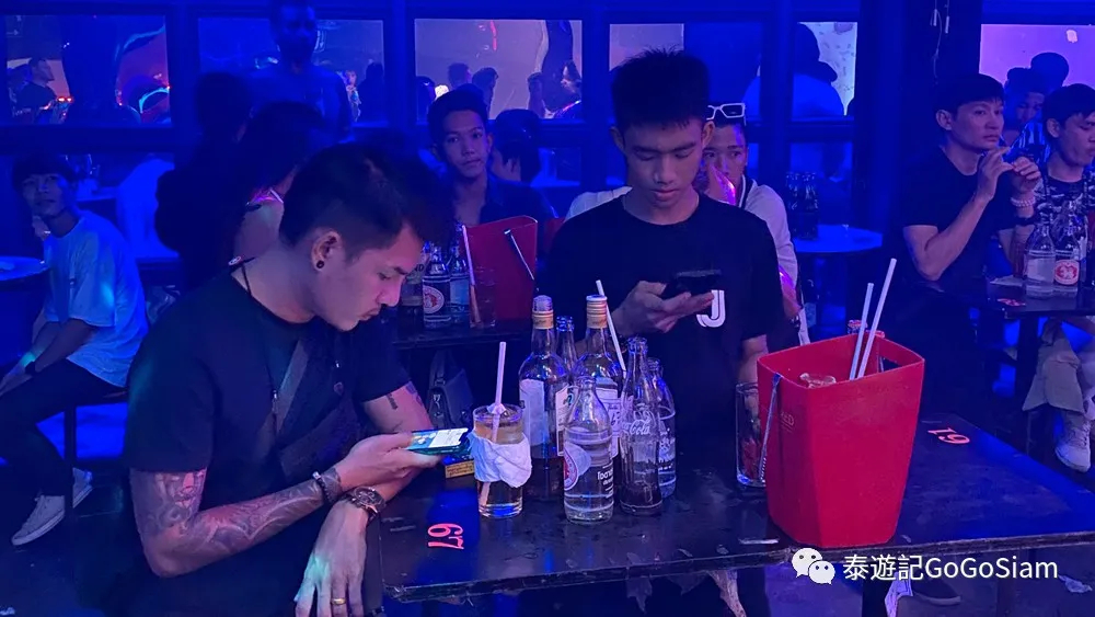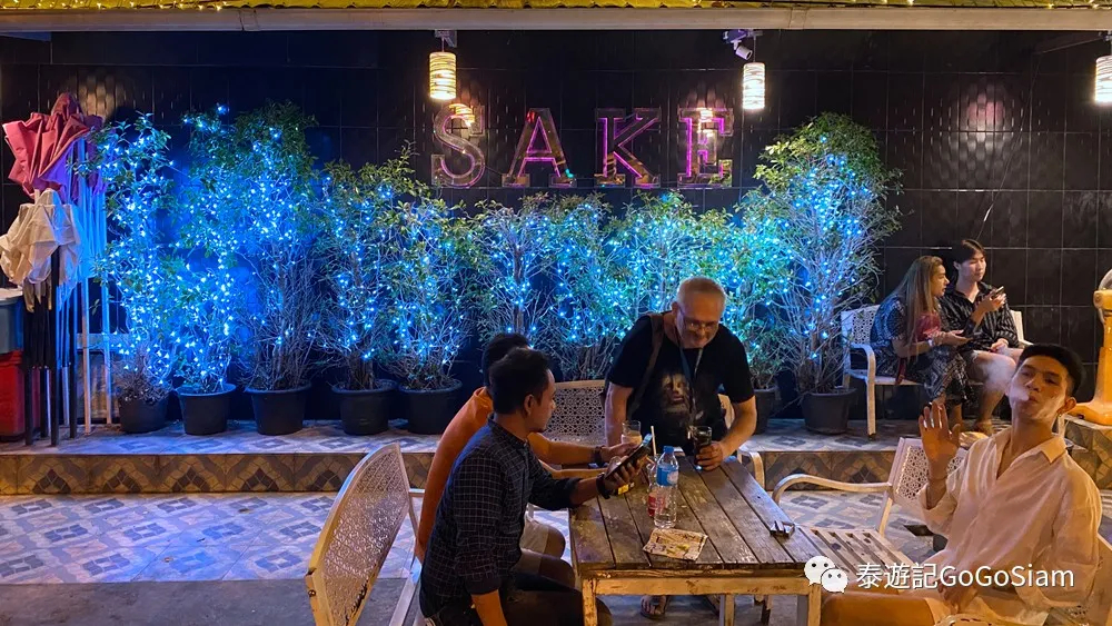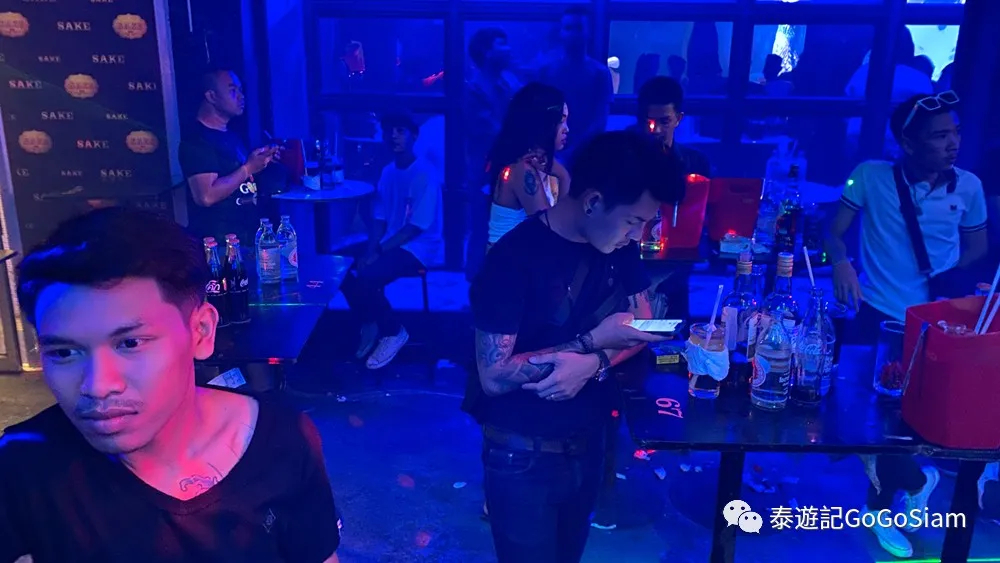Saké Pub酒水极为便宜,599泰铢甚至可以开一整套“泰国Whisky”,999泰铢开一套红标。取一些小口的one shot杯子,下面垫上100泰铢小费,很快桌边会聚集一群陪酒玩乐赚取小费的夜店泰仔前来搭讪。