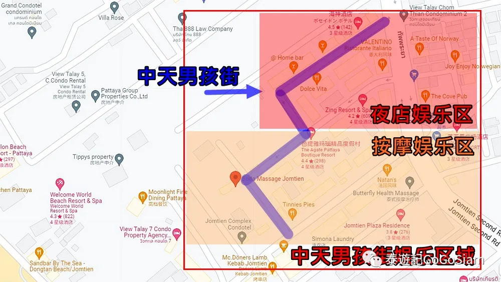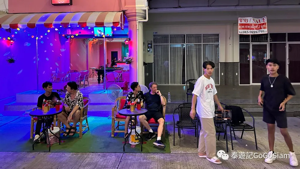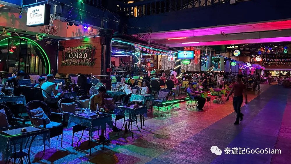从Jomtien Walking Street的正门进入,这里是很多小酒吧以及Massage店铺,店铺门口坐了很多招揽客户的泰仔,零星的游客走过,妈妈桑热情招呼。