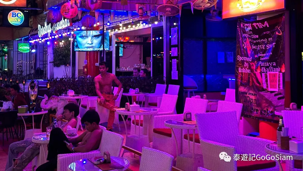 看不出中天男孩街各家夜店的具体差别,都是几排桌椅然后招了十几个泰仔陪酒玩乐聊天消遣。但八月的芭提雅,似乎狼多肉少,大部分桌椅都是空着,场面略有惨淡。