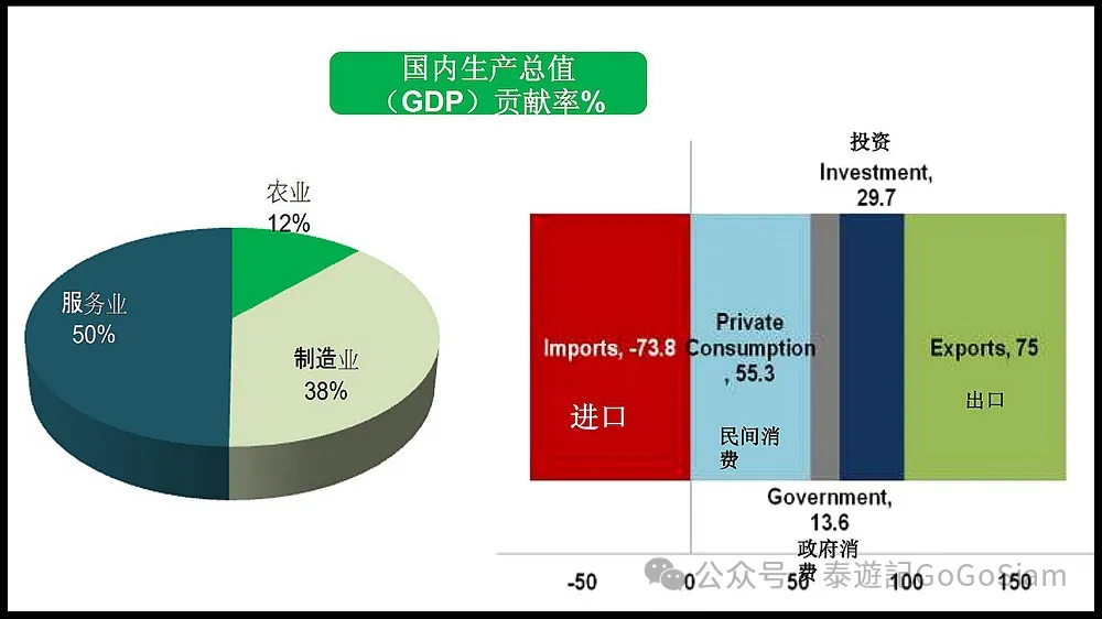 工业和服务业在泰国国内生产总值中占比较大:其中工业占比39.2%,服务业占比24.9%(服务业包括金融、教育、旅游、酒店及餐厅等行业)。农业是泰国的支柱产业,但整体GDP占比仅8.4%,低于贸易业(13.4%)和物流科技及通讯业(9.8%)。