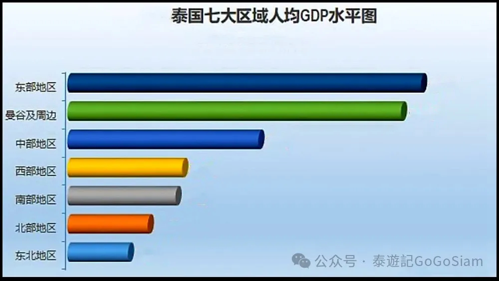 而泰国经济的区域分布,则40%的国内生产总值由大曼谷区贡献。中部及西部是泰国人口较少经济较为落后的地区(两个区域GDP贡献占比少于10%)。受到行业及区域不平衡性的影响,在大曼谷区的收入一般高于泰国其他地区,从事工业及金融行业的收入则高于其他体力或普通服务业。