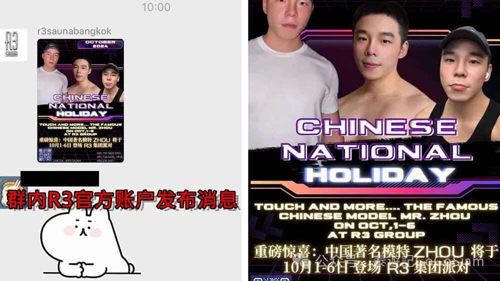 周末清晨,小编还在昨夜中秋宴席的宿醉。泰遊記粉丝群里早已热火朝天聊的不亦乐乎。曼谷R3桑拿的老板给小编推送消息,通知2024年10月中国国庆假期特别活动。某中国国籍“ZHOU”姓少男将作为R3 O-Party的特约男模现场献艺。小编定睛一看,好家伙,这位少男竟然是小编粉丝群中某网红的BF…