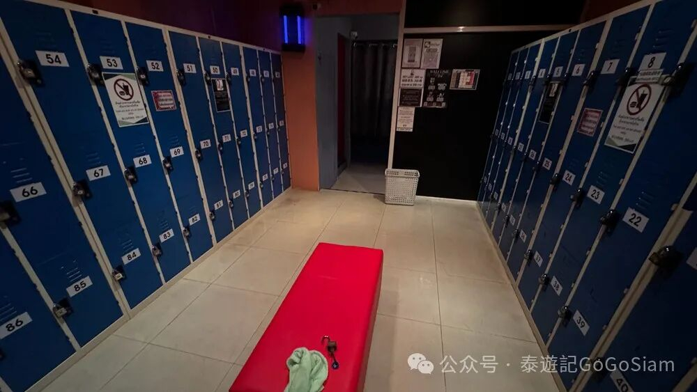 进门之后摸索了半天,总算发现更衣室在B层。更衣室有两排蓝色更衣柜,室内的长椅上坐着两三个体态略有黑壮的泰国人无聊的玩着手机。更衣室的对面是一间GV观影室,而在三两台阶的玻璃门里面则是淋浴、桑拿、芬兰浴、以及温泉池等功能区。