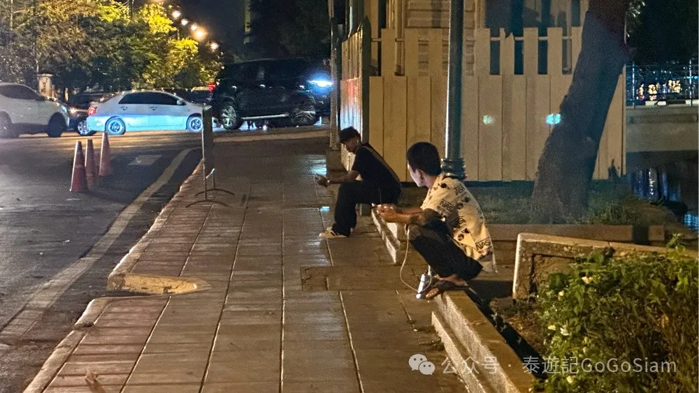 小编先是开车在“泰国内政部 ↔ 鲜花市场”简单溜了一圈。在公交站台、路灯下、或是茂密大树的台阶上,即便是23:00时分,依旧坐着很多年轻泰仔,见到车辆驶来,便会上前搭讪。
