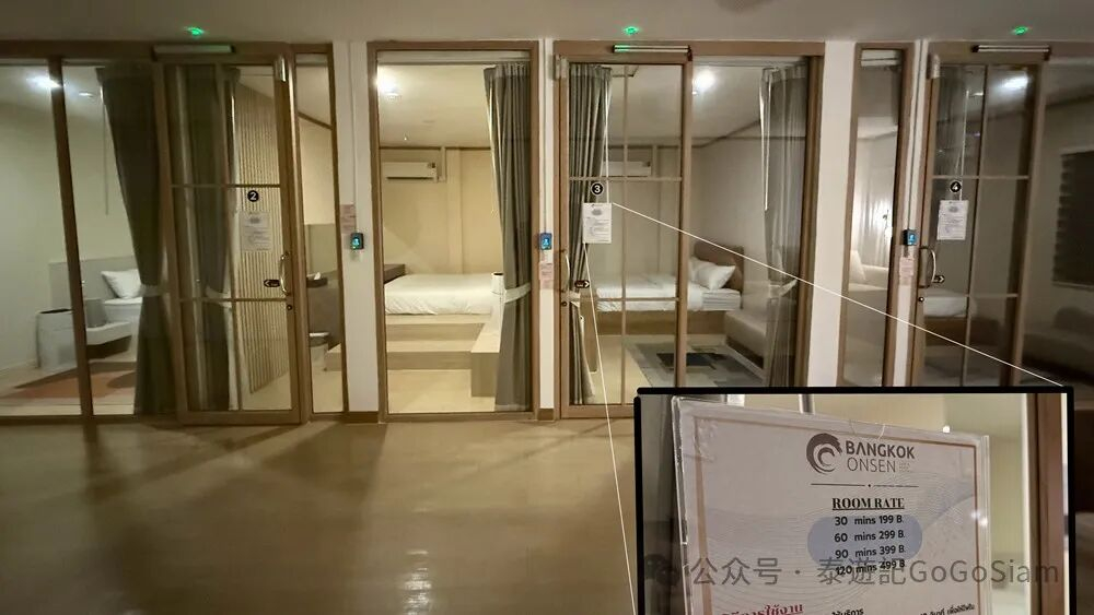 而到了五楼,则是可以刷卡入住的钟点房。半小时199泰铢,1小时299泰铢。窗明几净,看上去是给桑拿里面初见网友“休息缠绵”的好地方。