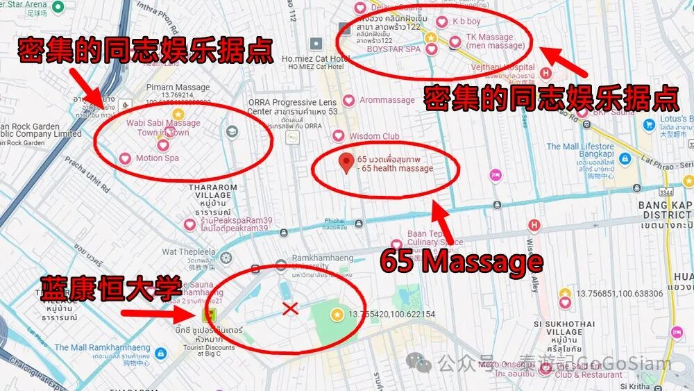 从Sathorn驾车去Ramkhamhaeng(蓝康恒)大概30分钟,在这个曼谷驻校人数最多的“野鸡大学”附近,同志娱乐活动亦是热闹。例如,Wisdom Host Bar、Arom Massage、Kb Boy、TK Massage等都在附近。