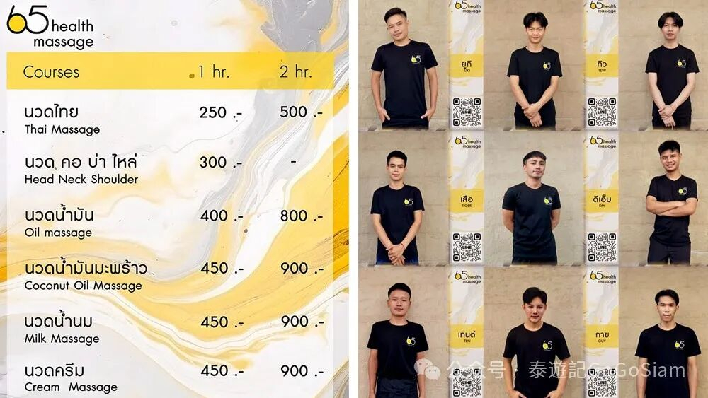 如果是Walk-in,在65 Massage的前台可以照片选择技师。无论是泰式按摩还是精油按摩都是独立房间。蓝康恒附近的泰仔按摩技师极为淳朴,按摩标准,下手有力,120分钟按摩即便Happy Ending也会补足按摩时间。
