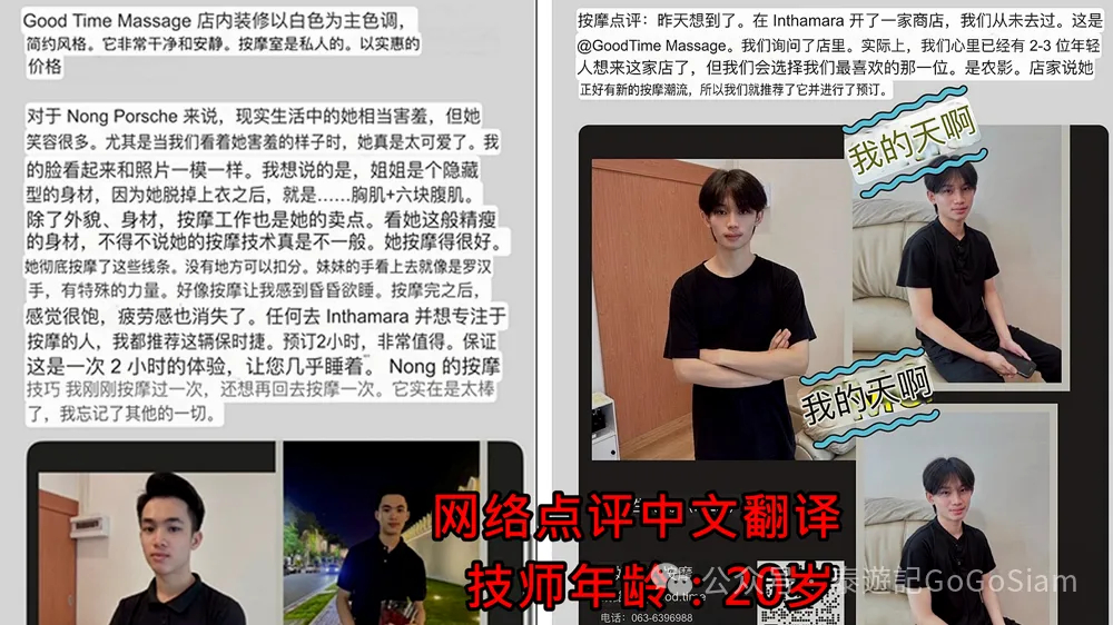 简直了,三百块同志娱乐区又开新店,300泰铢20岁泰仔正经按摩亦是很棒。Good Time Massage与U-Sabai、Amor以及Kline类似,是一家按摩技术不错,可以静心享受按摩的好店。